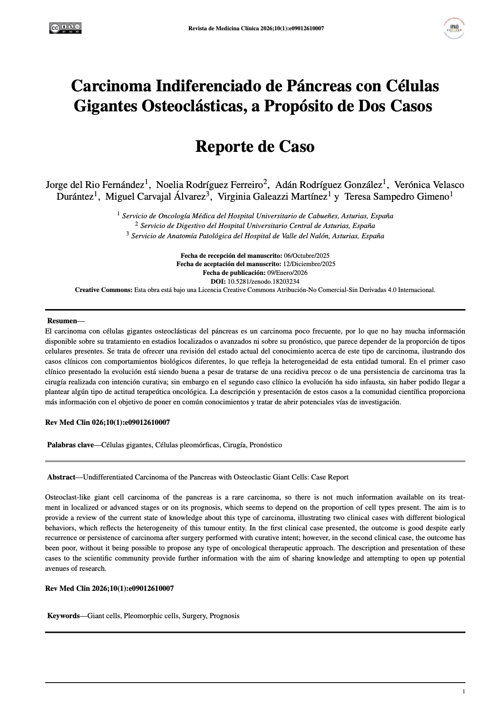 Carcinoma Indiferenciado de Páncreas con Células Gigantes Osteoclásticas, a Propósito de Dos Casos. Rev Med Clin [Internet]. 2026 Jan. 9 [cited 2026 Jan. 27];10(1):e09012610007. Available from: https://mail.medicinaclinica.org/index.php/rmc/article/view/711