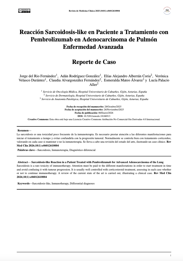 Reacción Sarcoidosis-like en Paciente a Tratamiento con Pembrolizumab en Adenocarcinoma de Pulmón Enfermedad Avanzada. Rev Med Clin [Internet]. 2026 Jan. 6 [cited 2026 Jan. 27];10(1):e06012610004. Available from: https://mail.medicinaclinica.org/index.php/rmc/article/view/718